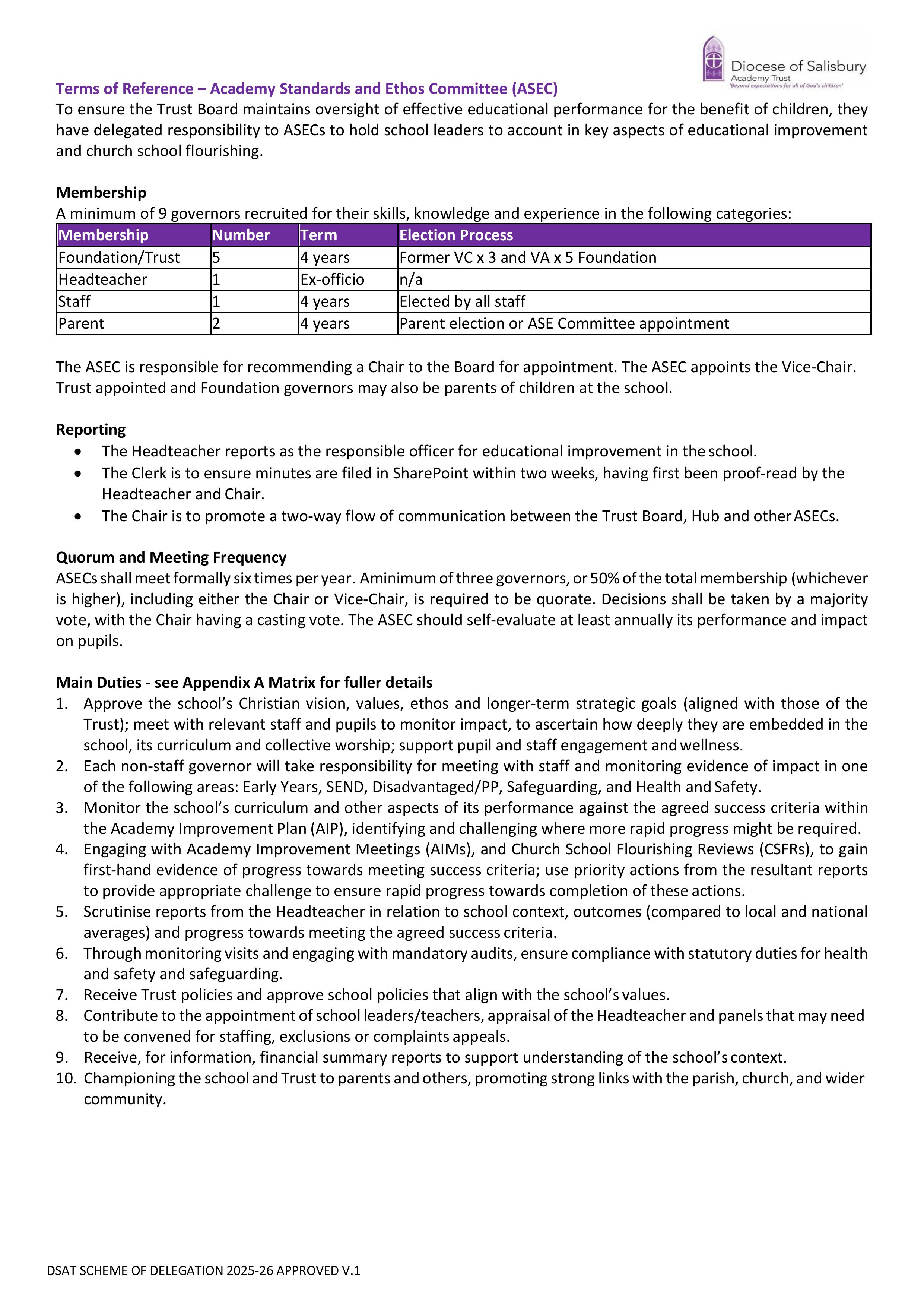 We are members of the Diocese of Salisbury Academy Trust and the governance of the Trust belongs to the main DSAT Board. Our Scheme of Delegation also includes our Constitution and Terms of Reference. Paper copies can be obtained through the school office or by using the contact us option on this website. You can find details of the Trust Board and details of our Trust Governance by visiting the DSAT Governance page.